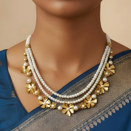 Triple Layered Floral Necklace with Pearls