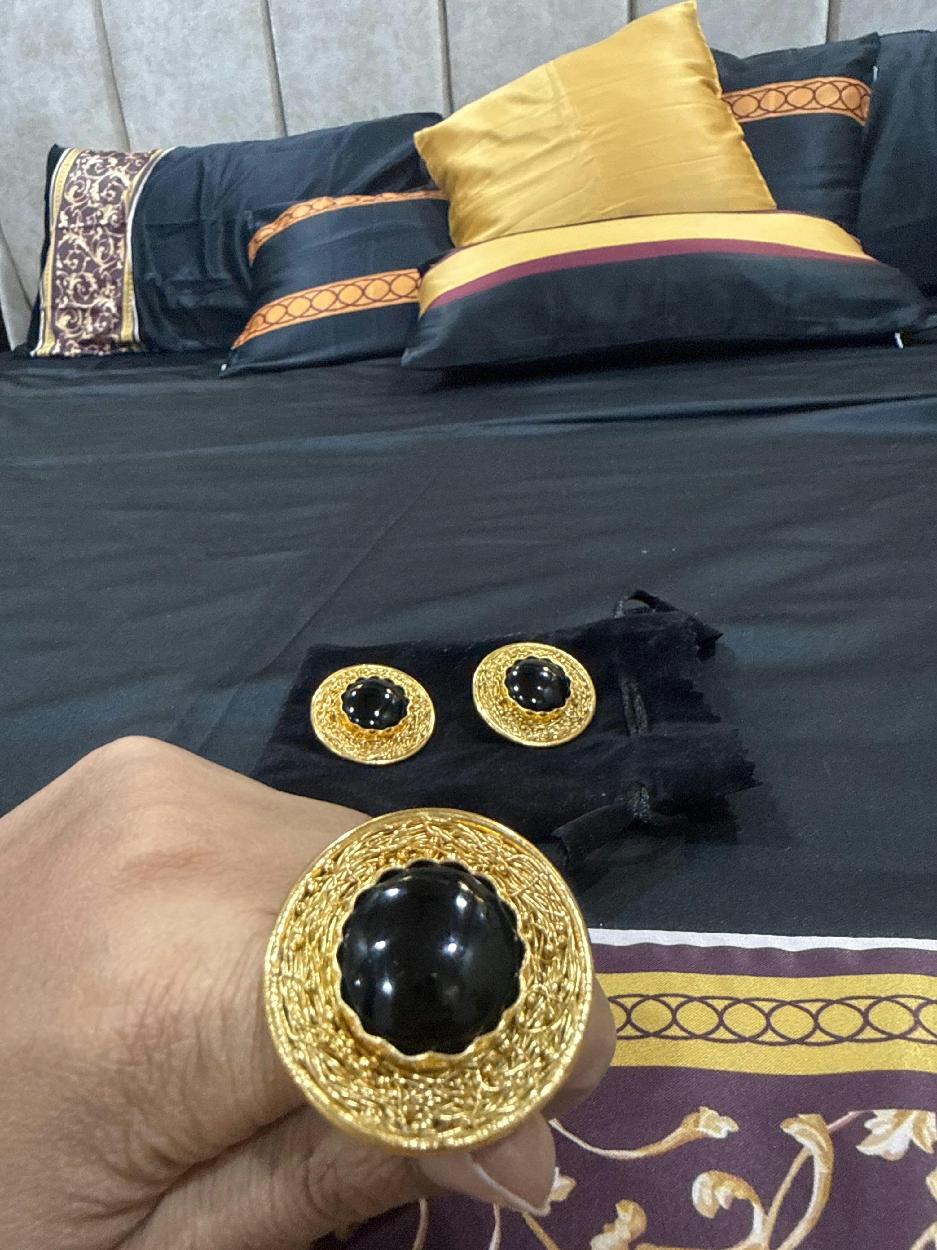 Brass with 22k Gold Plating and Coating. Jewelery is nickel free. Stone used is semi precious Black Onyx.